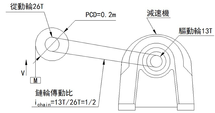 搬送速度;V=9.5m/min 鏈輪傳動效率:η1=1 減速機傳動效率:η2=0.9 運轉(zhuǎn)時間:2小時/日 啟動次數(shù):1回/分,中沖擊 使用電源:三相220V,50Hz 計算;一、減速比 由入力回轉(zhuǎn)數(shù)及出力軸回轉(zhuǎn)數(shù)來選定減速比 1、先求出輸送帶滾輪回轉(zhuǎn)數(shù)(N1) 1.N1=V/(PCD xπ) N1=搬送速度/(滾輪直徑PCD·π) =9.5/(0.2 x 3.14)=15r/min 2、再求出減速及出力軸回轉(zhuǎn)數(shù)(N2) 2.N2=N1/ichain N2=N1/鏈輪齒數(shù)減速比 =15/(1/2)=30r/min 3.以三相機60Hz的馬力計算減速比 3.i=30/1500=1/50 i=出力軸回轉(zhuǎn)數(shù)/入力軸回轉(zhuǎn)數(shù)(電機轉(zhuǎn)數(shù)) 二、扭力 決定減速比后,由使用機械工作條件計算減速機出力軸扭矩 1、先計算出輸送帶滾輪之扭力(T1) 1.T1=M·PCD/2 T1=M·PCD/2 =300x0.2/2=30kg.m 2、再換算成減速機出力軸所需扭力(N2) 2.T2=(T1·ichain)/( η1·η2) T2=(T1·ichain)/(η1·η2))=(30x0.5)/(1x0.9)=16.7kg.m 三、負荷條件 1.根據(jù)運轉(zhuǎn)條件算出修正后的扭力(T3) 1.T3=T2·K T3=T2·K =16x7·1 (系數(shù)K無沖擊時=1,沖擊越大,K值越大)=16.7kg.m 四、馬力 1.最后算成馬力(Hp) 1.Hp=(T3·N2)716.2 Hp=(T3·N2)/716.2 =(16.7x30)/716.2=0.7Hp……(3/4Hp) 摩擦系數(shù)表